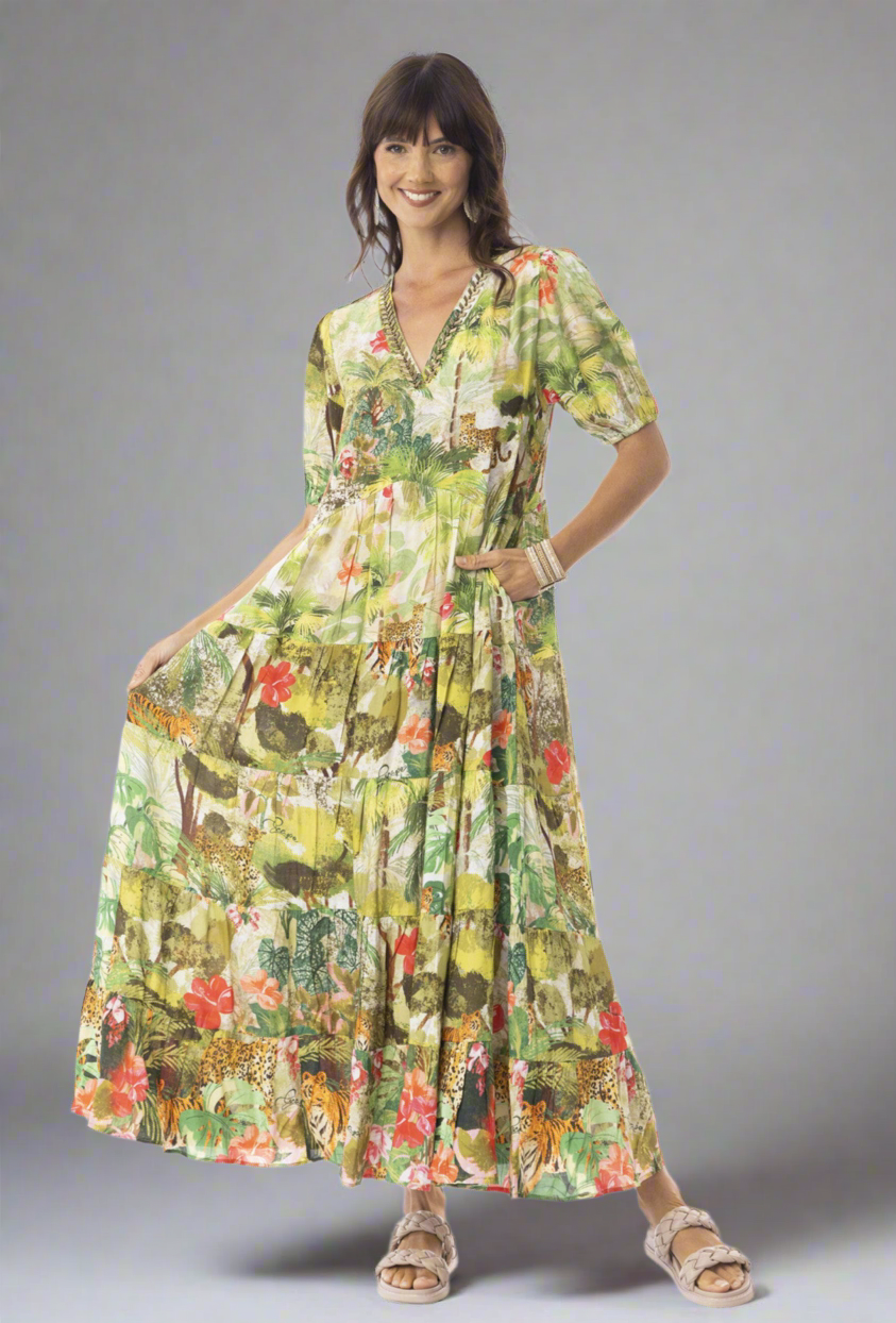 Fall in love with the enchanting Cecilia Maxi Layer Dress. This dress features a flattering v-neckline, gathered half sleeves, and gathered seams at the bust which fall into a beautiful tiered skirt, creating a feminine silhouette. Its jungle tropic aesthetic makes this the perfect standout summer dress!